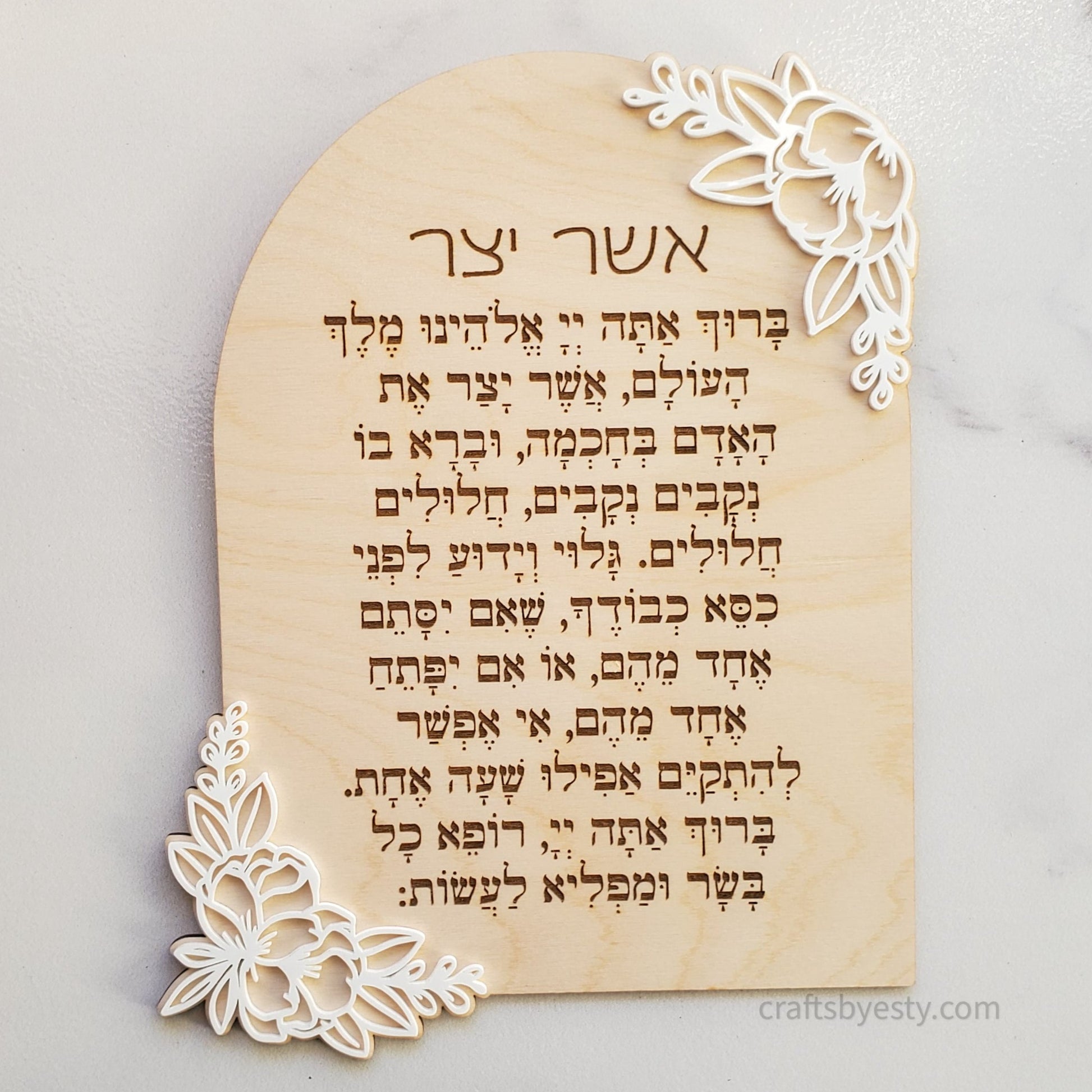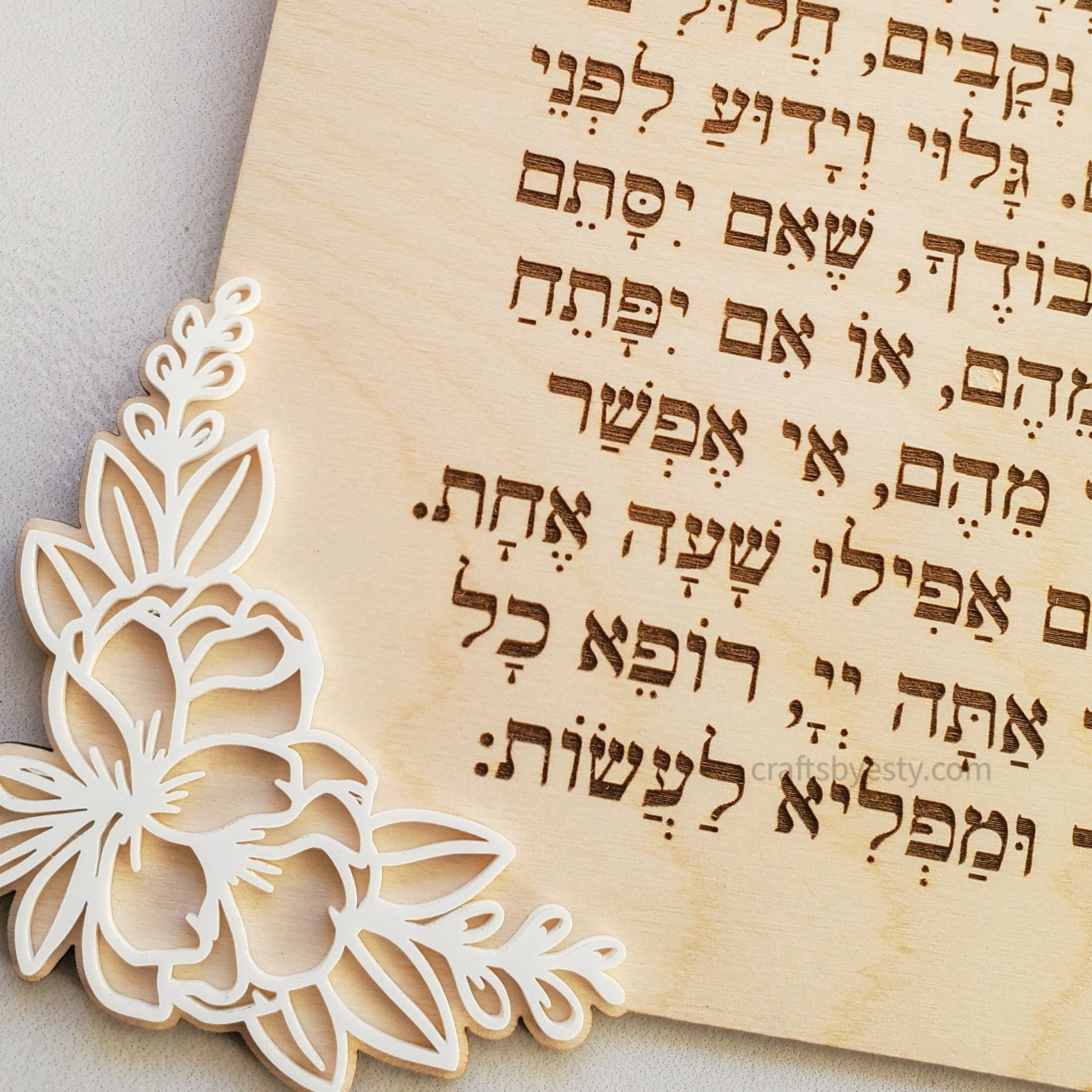 Beautiful & clean looking wood engraved arched sign with acrylic floral accents. Sign is in Chabad Nussach.